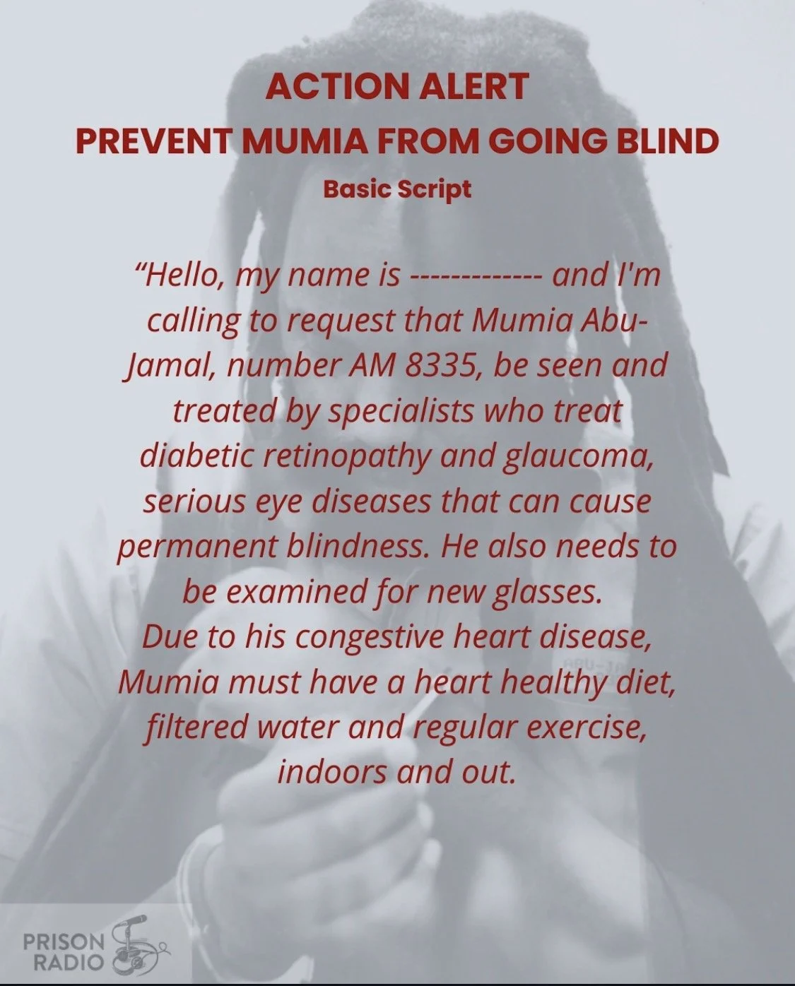 Abu-Jamal, who spent 29 years in solitary confinement, was blind for eight months until receiving cataract surgery. More medical care is still needed to prevent him from permanent vision loss. Organizers with the Mobilization for Mumia have been holding regular organizing calls and sending daily letters to the Pennsylvania Department of Corrections, calling for a new physician to be assigned to Abu-Jamal’s case and for eye surgery to be scheduled. While demands for Abu-Jamal’s urgent medical needs are strong, organizers say that his story should call attention to the medical needs of incarcerated people nationally and internationally.