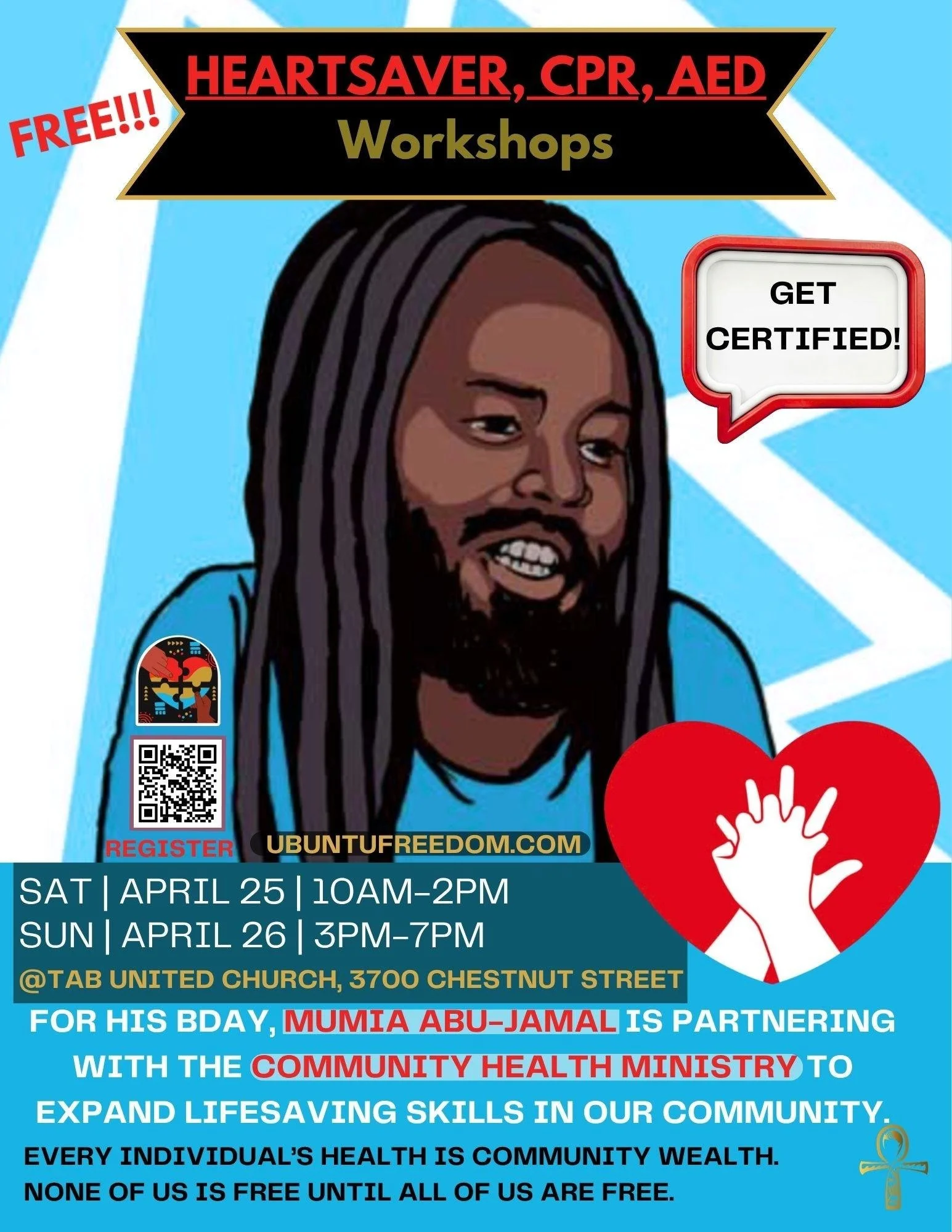 To initiate this program, we and other community organizations are offering our first two training sessions in partnership with Mumia Abu-Jamal on April 25th and April 26th (see attached graphic for specifics). Our FREE training program will include: